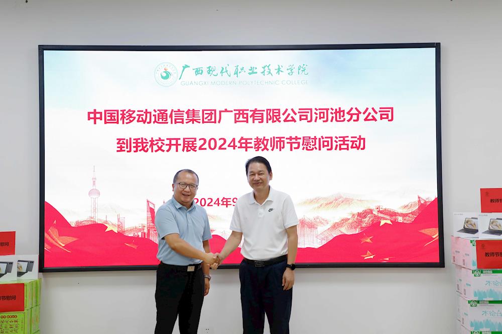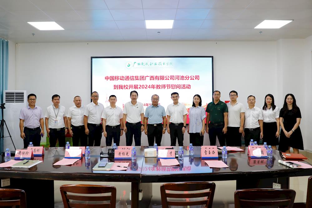中国移动通信集团广西有限公司河池分公司党委书记、总经理刘江一行到我校座谈交流并进行教师节慰问。黄绍光详细介绍学校的建设发展情况。刘江致辞,简述企业教育合作项目,向学校捐赠慰问品。