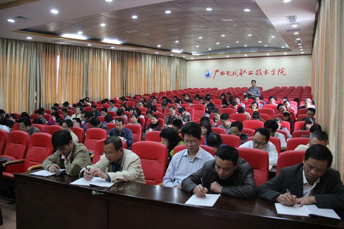 学院教育实践活动办讯 4月8日下午,我院在第二学术报告厅召开党的群众路线教育实践活动第四次集中学习研讨会。市委副秘书长、学院党委书记韦伟松出席会议并作题为《践行社会主义核心价值观 争当优秀共产党员》专题报告。学院纪委书记覃志航,副院长冯忠伟等中层以上领导干部以及全体党员参加了学习研讨会。