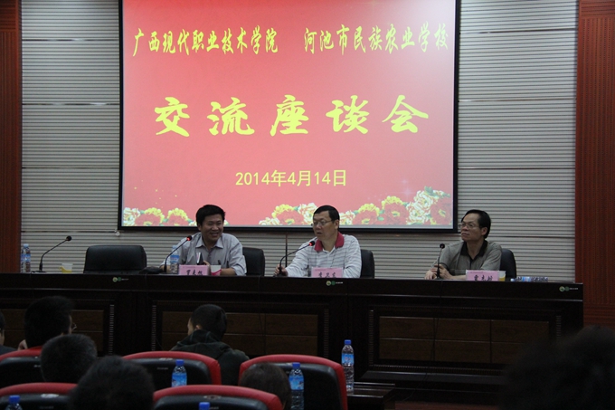 随后,两校与会人员就部门对应的管理工作等方面进行交流。罗来旭校长还在交流会上作了发言,他说,广西现代职业技术学院是河池市职业教育的龙头,有着优美的校园环境、雄厚的师资力量、丰富的教育资源、现代化的教学设备和实训基地,以及日益扩大的办学规模。我们学校此次组团参观学习,目的是全面贯彻河池市的职业教育工作会议精神,学习广西现代职业技术学院如何做大做强职业教育的政策措施,为推进河池市职业教育集团化办学工作做出应有的贡献。