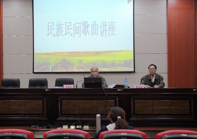 讲座中,陈恒芳老师着重以河池地区民间歌曲为主线,从民间歌曲的地位及价值入手,分析了河池地区民间歌曲的生存现状,重点分析了民间歌曲的文化特征。陈恒芳老师认为河池地区民间歌曲内容丰富、形式多样,具有多元化及浓厚的少数民族特色等艺术特征,具有丰富的人文历史价值。他还呼吁同学们要积极学唱民间歌曲,传承我们自己的民族音乐文化。