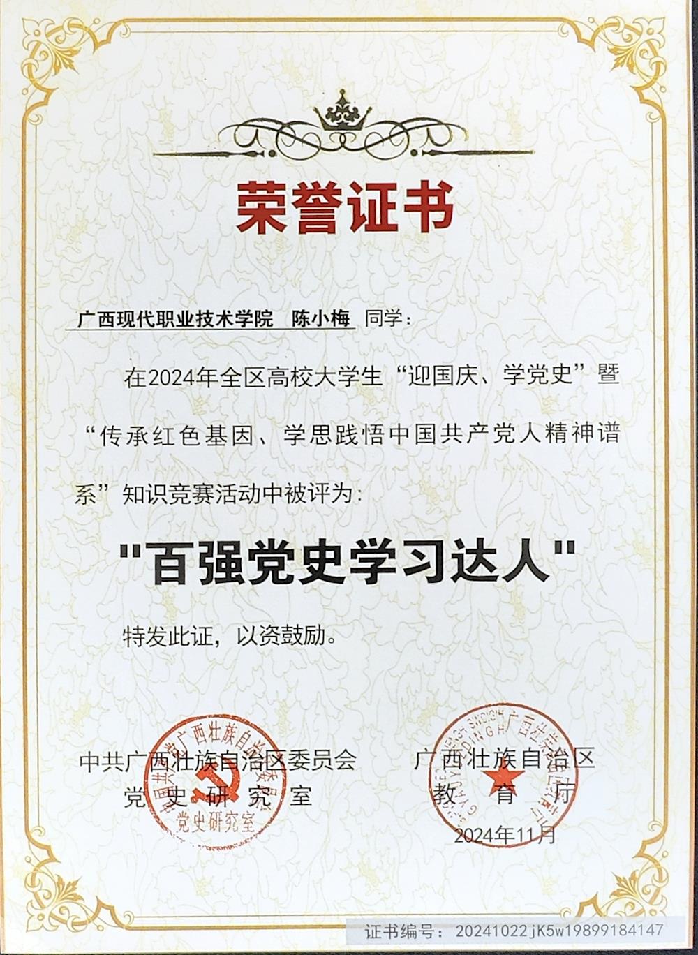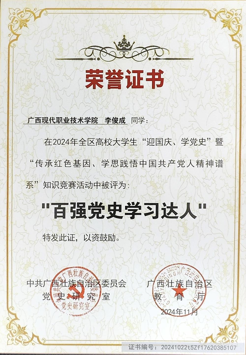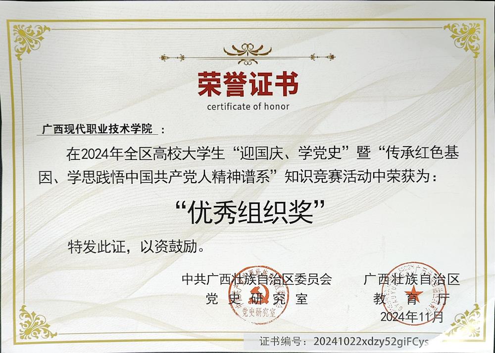 近日,全区高校大学生“迎国庆、学党史”暨“传承红色基因、学思践悟中国共产党人精神谱系”知识竞赛广西赛区决赛获奖名单公布。我校荣获“优秀组织奖”,建筑工程学院陈小梅、信息工程学院李俊成两位同学被评为“百强党史学习达人”,智能冶金学院陈广远等15位同学被评为“党史学习达人”。