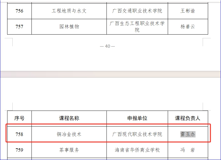 12月9日,教育部公布了2023年职业教育国家在线精品开放课程认定结果,由我校智能冶金学院雷玉办院长主持、林忠、蓝光泽、林信攀、石明芳等老师参与建设的《铜冶金技术》课程成功入选,是我校课程建设取得的又一标志性成果,标志着我校在线精品开放课程建设迈上新台阶。