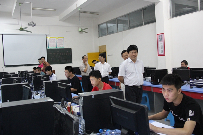学院党委宣传部讯 6月12日,市委副秘书长、学院党委书记韦伟松在副院长冯忠伟以及相关部门负责同志的陪同下,分别深入汽车实训室、数控实训室、电子电力实训室、精细化工产品实验室、工业分析实训室、计算机基础实训室等地现场抽查学生技能测试情况。