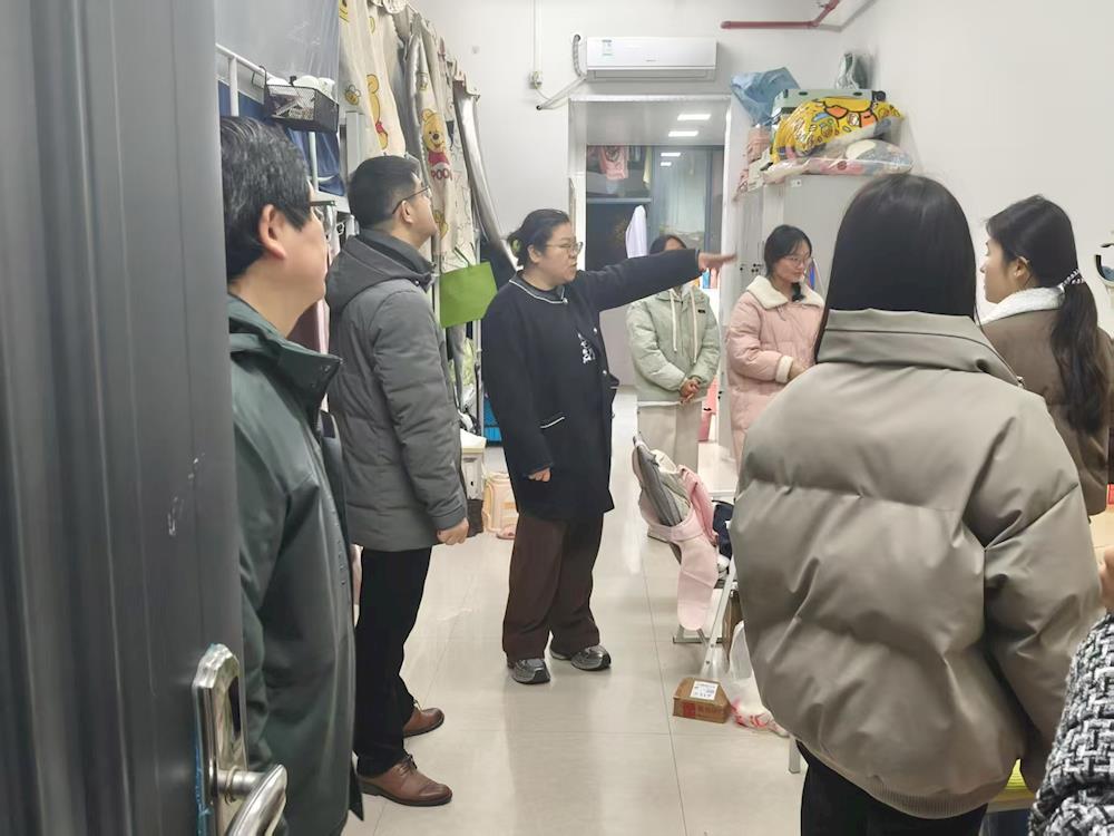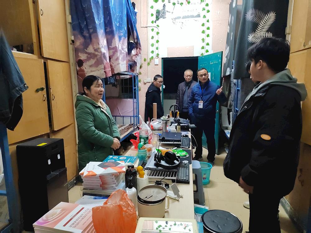 岑华带队走访教师教育学院学生宿舍,对宿舍的卫生、内务及安全等方面进行了细致检查,并认真听取同学们的意见和建议,鼓励同学们要保持良好的生活习惯。