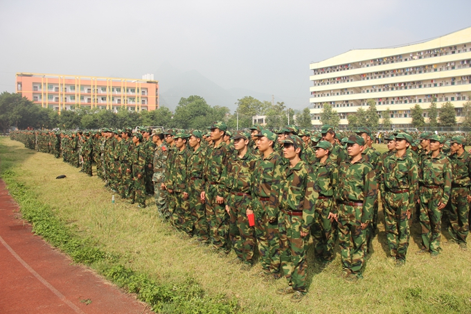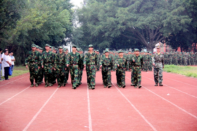 党委宣传部讯 飒爽英姿秋点兵,激昂斗志威震天。9月15日,我院2014级学生军训汇报表演暨总结表彰大会在学院田径运动场隆重举行。纪委书记覃志航在会上作军训总结讲话。副院长韦胜东宣读军训表彰决定。大会由学工处处处长岑华主持。武警河池市支队参谋长范长俊,学工处、团委、教科处、后勤处、保卫处、各教学系有关领导老师以及2300多名参训新生参加大会。