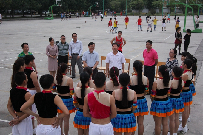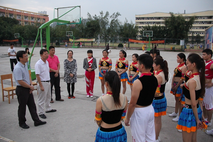 学院党委宣传部讯 10月21日,即将代表河池市出征广西第十三届少数民族传统体育运动会的学院健美操队,在学院文体广场进行赛前彩排。河池市民族事务委员会主任黄柯云亲临现场指导,并对全体参赛队员提出了殷切的希望。学院体育部、学工处等相关部门负责人参加赛前彩排。