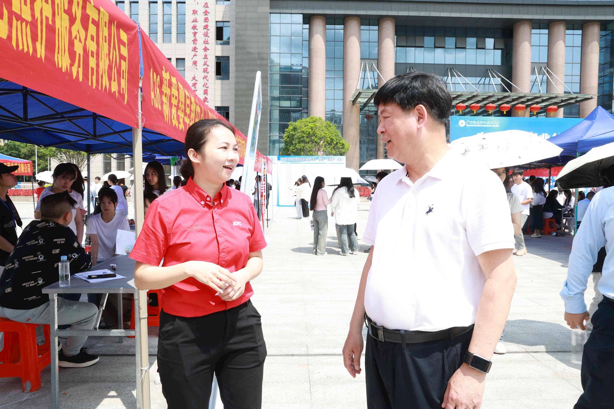 广西现代职业技术学院高度重视此次双选会活动。河池市政协副主席、学校党委书记韦伟松,纪委书记张斌,副校长黄耀等校领导深入现场,与用人单位招聘人员交流洽谈,详细了解企业的人才需求和发展前景,认真听取用人单位对学校人才培养的意见和建议。韦伟松表示,学校将继续深化产教融合,探索校企合作新模式,聚焦区内外优质企业,服务河池地方经济发展,为毕业生提供更多优质就业岗位。