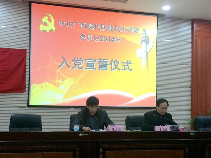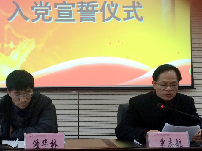 党委宣传部讯 12月29日下午,我院在第二学术报告厅召开2014年新党员入党宣誓仪式,学院纪委书记覃志航、党委组织部部长潘华林,各系党总支书记出席会议,72 名预备党员及相关老师参加此次大会。会议由潘华林主持。
