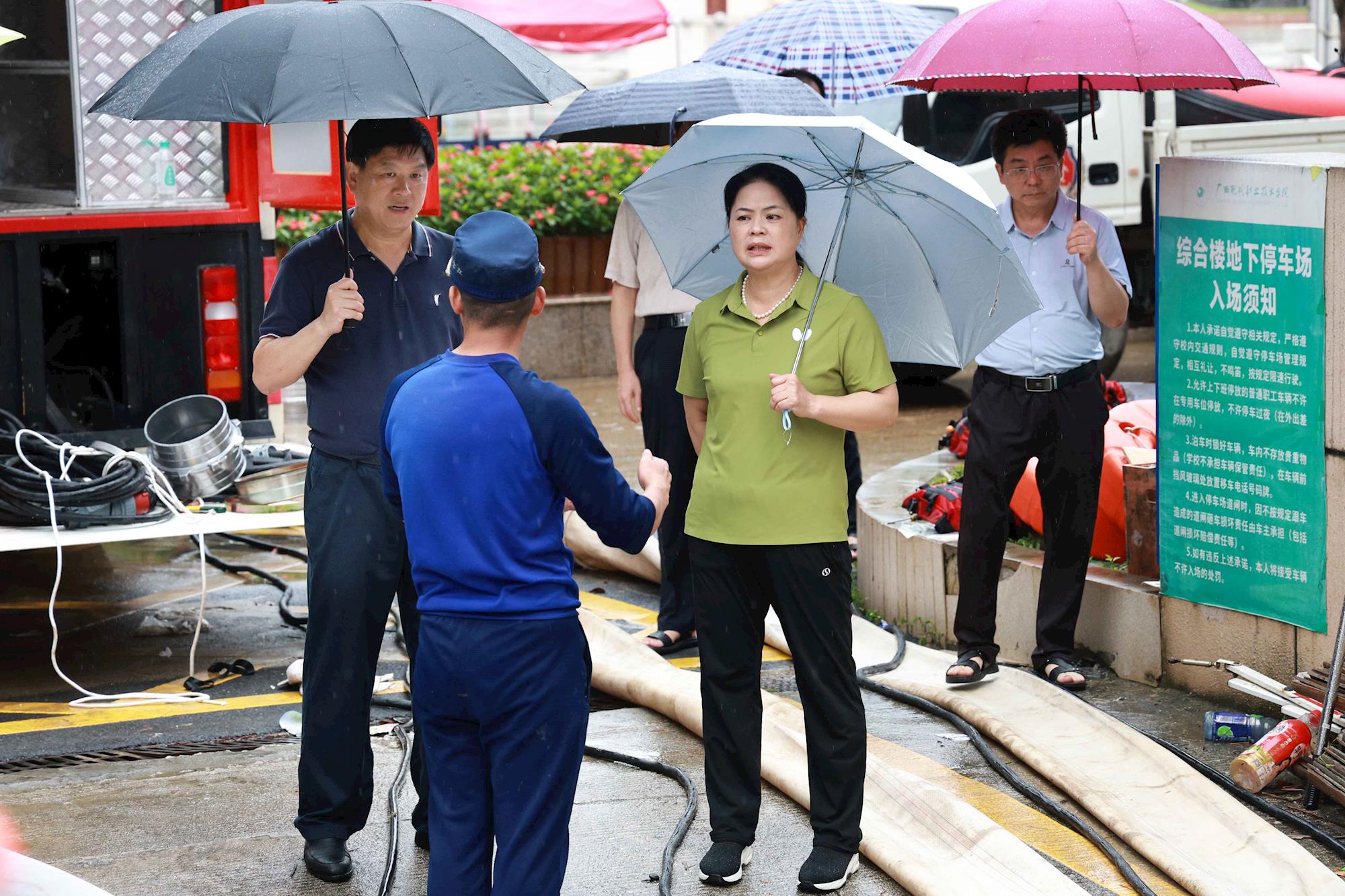 险情就是命令!学校党委迅速行动起来。河池市政协副主席、学校党委书记韦伟松第一时间带领校领导班子成员火速赶赴学校,冲在抢险救援的第一线,深入到积水最深的区域,实地查看险情,了解被困师生情况,现场指挥抢险救援工作。与此同时,正在外出的校长黄绍光和分管后勤的梁朝益副校长也紧急返回学校,并通过线上方式与书记协同指挥救援。在学校领导的迅速部署和各方的紧密配合下,一场紧张而有序的抢险救灾工作在学校全面展开。
