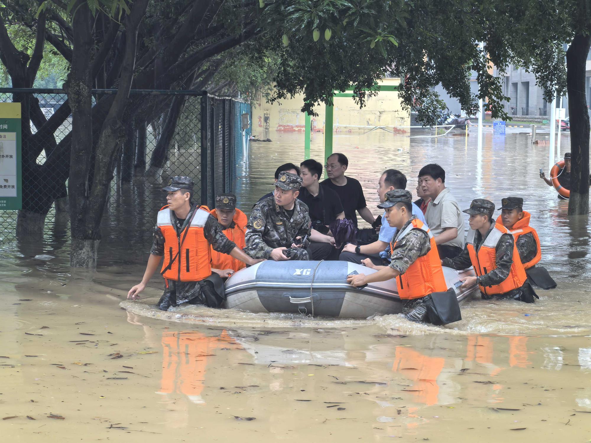 在6月21日上午,水位迅速猛涨之时,河池市救援大队、武警部队、应急管理局的人员火速赶到学校。8艘冲锋舟、150多名官兵迅速投入到救援行动中。他们蹚着齐腰深的积水,与学校师生并肩作战,转移师生和校内居民,运送物资,发挥重要作用,成为抢险救援的中坚力量。冲锋舟在湍急的水流中穿梭,一次次将被困师生和校内沿河住宿楼居民转移到安全地带。