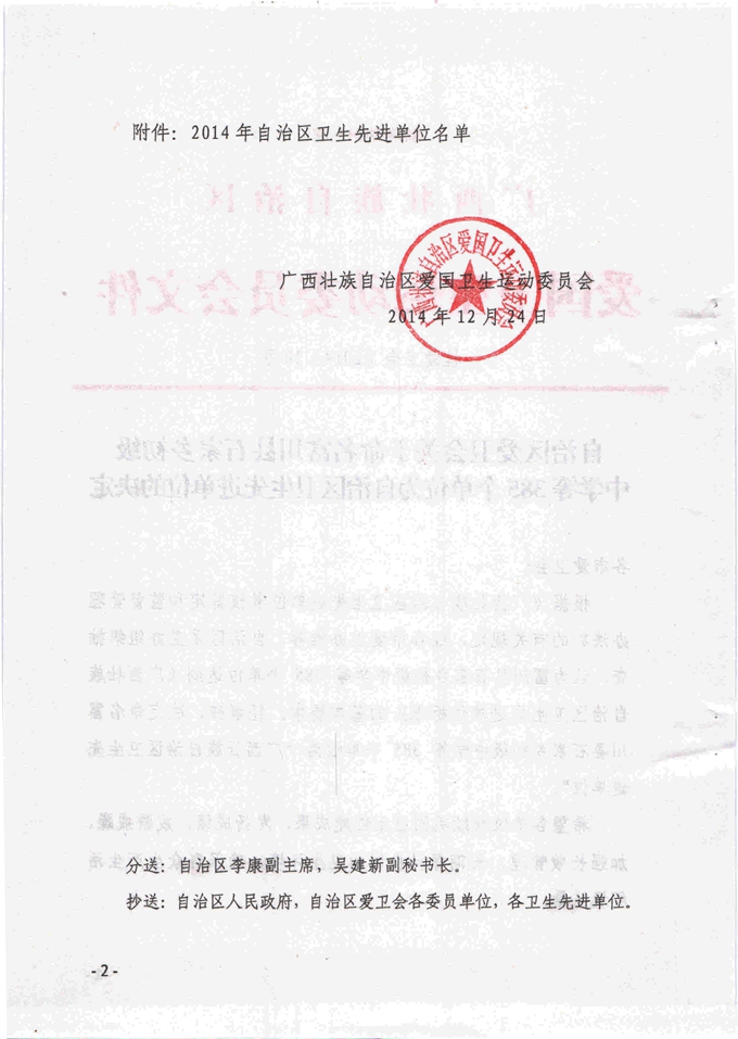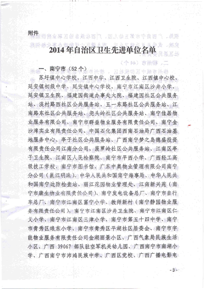 后勤管理处讯 日前,在广西壮族自治区爱国卫生运动委员会组织的年度卫生评比中,我院荣获2014年自治区卫生先进单位,成为385个先进单位之一。