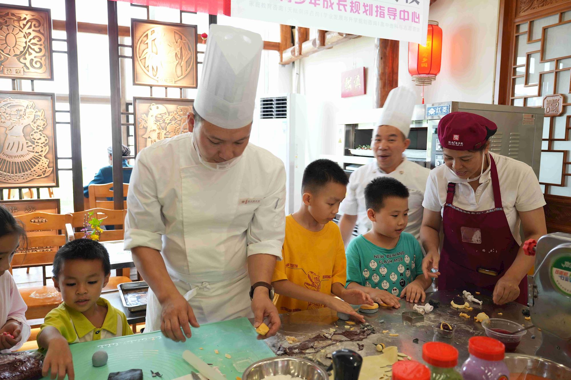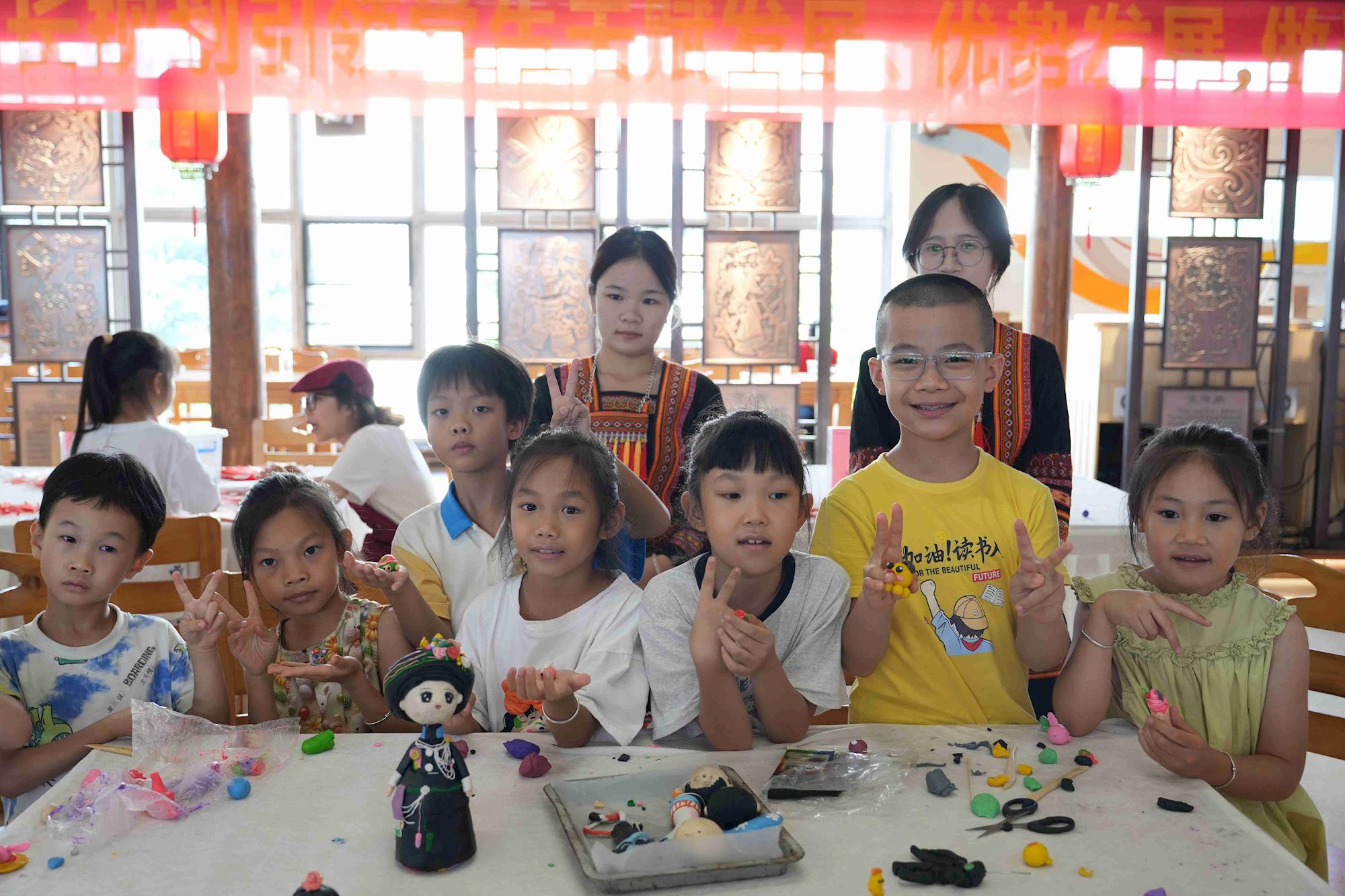 发布会后,由职教中心团委主办的“携手同行、筑梦未来”民族文化传承社区教育公益活动,让参会人员沉浸式的感受民族文化魅力。来自两校及河池寿乡园的教师、学生干部,化身“民族文化传承使者”,给大家送上一场丰盛的民族文化大餐。家长、孩子们一边品尝烹饪大师精心制作的民族糕点,一边轮流体验泥塑、刺绣、剪纸、彩绘、面点、果饮等制作,还快乐的玩起奥尔夫音乐互动、帐篷捉迷藏等游戏……