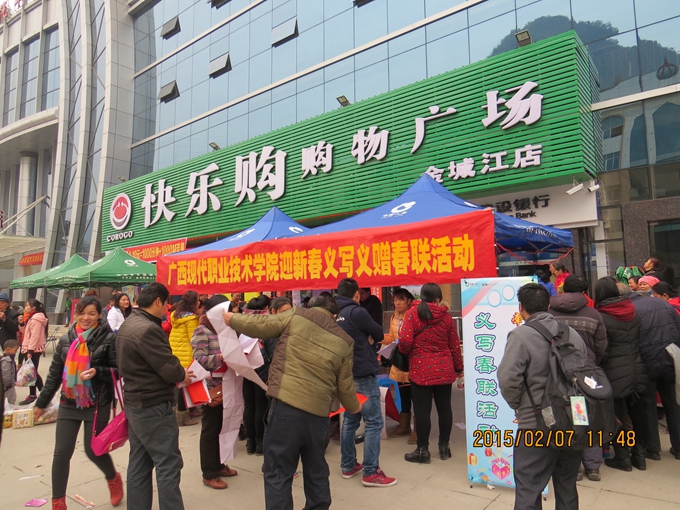 学院党委宣传部讯 2015年2月7日,广西现代职业技术学院联合河池市市直书法家协会在河池城西客运站购物广场前开展迎新春义写义赠春联活动,河池市市直书协主席龙介池、常务副主席潘立举、秘书长蒙家辉、副秘书长郭旷应邀参加活动并为市民现场义写春联。