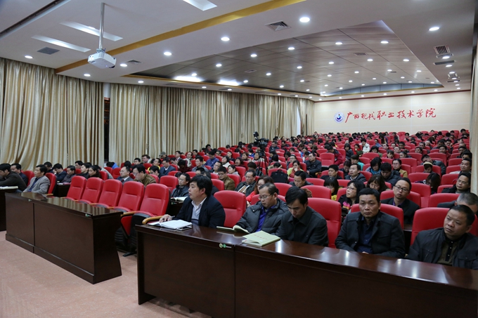 学院党委宣传部讯 3月12日下午和晚上,我院在第二学术报告厅召开全体教职工大会。大会表彰了学院2014年度“工作业绩突出”人员,听取和评估了各系部主任的工作报告,部署了2015年工作任务。市委副秘书长、学院党委书记韦伟松,院长黄绍光出席大会并作重要讲话。会议由纪委书记覃志航主持。副院长冯忠伟、韦胜东参加会议。
