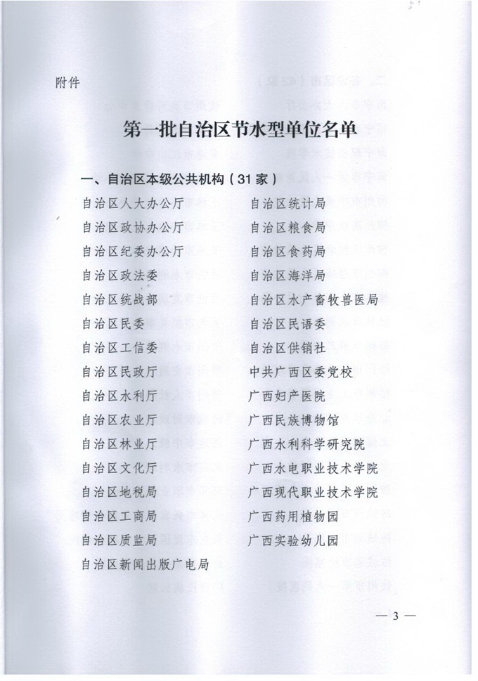 创建节水型单位是公共机构节能工作的重要内容之一。我院高度重视,按照节水型单位创建评分标准、程序和要求,积极开展节水宣传,建立健全管理机制,细化落实管理责任,采取有效管理措施,认真做好创建工作,营造了良好的舆论氛围。经过申报、创建、初评、复核、公示等环节,我院和自治区人大办公厅等73个单位共同被确定为自治区第一批节水型单位,在社会各界树立了示范和表率作用。