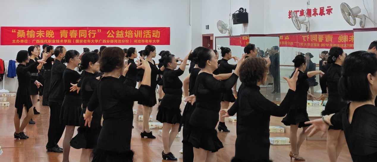10月10日—11月2日,广西现代职业技术学院联合河池市老年大学开展了拉丁舞班、声乐基础班、手风琴班、形体仪态班、摄影班等公益培训活动,参与人数达500人。
