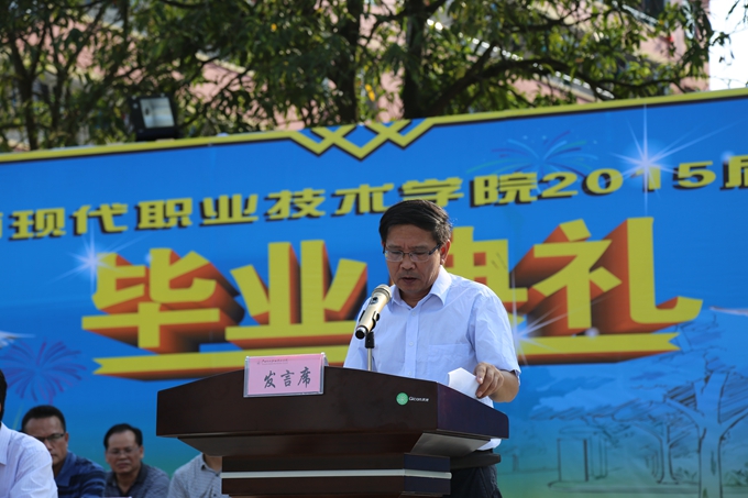 6月29日上午,学院2015届学生毕业典礼在文体广场隆重举行。市委副秘书长、学院党委书记韦伟松,院长黄绍光,副院长冯忠伟等院领导出席毕业典礼,并为毕业生和优秀毕业生颁发毕业证书和荣誉证书。毕业典礼由副院长韦胜东主持。各系、部分部门负责人,毕业班班主任、辅导员、教师代表、毕业生代表以及部分在校生参加了毕业典礼。