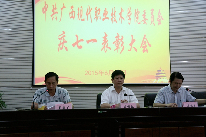 下午2点40分,在雄壮的国歌声中,表彰大会开始。学院副院长韦胜东同志宣读了学院党委表彰文件。市委副秘书长、学院党委书记韦伟松,院长黄绍光等领导为获得表彰的先进集体和个人颁发荣誉证书。