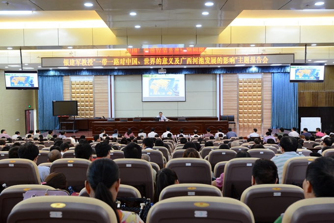 银教授从“一带一路”提出的背景,“一带一路”与中国经济对外开放新格局,“一带一路”与世界均衡发展、“一带一路”与河池的发展,丝绸之路演变的价值和意义、发达国家的内外战略与发展启示、近现代世界经贸与政治格局的演变等方面,就“一带一路”建设对中国与世界的意义进行了深入浅出的解读和系统阐述。