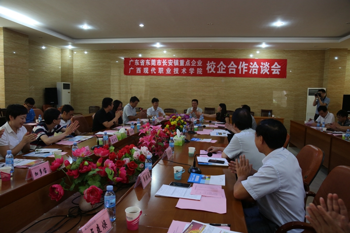 考察团先在黄院长的陪同下,依次参观了我院校园环境、学前实训楼、汽车实训室等,然后在学院图书馆会议室召开座谈会。座谈会由韦胜东副院长主持,考察团首先观看了我院发展的专题纪录片。接着,黄绍光院长在会上向考察团介绍了学院的办学理念、人才培养、学科建设、培养模式等。东莞市长安镇重点企业领导在座谈会上也一一介绍了各自企业的用工信息和用工需求,渴求在我院招到毕业生。