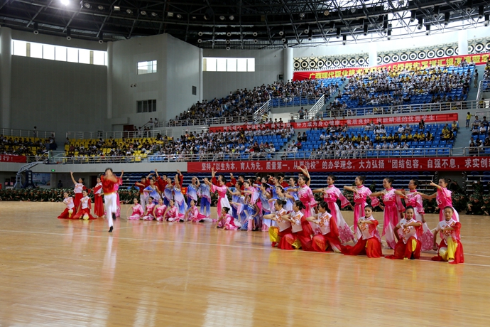 分列式后,文艺汇报表演开始,集中展示了我院师生风貌及专业教学成果。由学前专业的哥哥姐姐们表演的大型舞蹈表演《永远跟党走》《西山红云》,整齐且富有表现力的舞蹈动作激起了我们热爱党,热爱祖国、热爱和平的感情;由新生标兵代表组成的方阵展示搏击操表演,整齐刚劲的动作、坚定嘹亮的口号,展示着现代学子的自信和刚强;师生同台献艺的《红歌串烧》节目,充分展示我院师生积极向上的精神风貌;教官擒敌术表演更是吸足了整场观众的眼球,擒拿摔术,实摔的倒功、实战的擒敌,过硬的功夫、致敌的招数,男儿的刚强搏得观众连声叫“好”!
