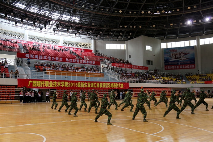 学院党委宣传部讯 9月20日下午,我院2015级新生军训汇报表演暨总结表彰大会在体育馆隆重举行。市委副秘书长、学院党委书记韦伟松出席大会,学院党委副书记、院长黄绍光检阅军训学生方队。武警河池市支队副参谋长马宗伟、河池市教育局副调研员张发林、金城江区消防中队队长廖煌稳、学院纪委书记冉景峰、河池市职教中心常务副校长何成相、学院工会主席覃志航(副处级)、各县职教中心校长及相关领导出席大会。与会领导为获奖集体和个人颁奖。副院长韦胜东主持大会。