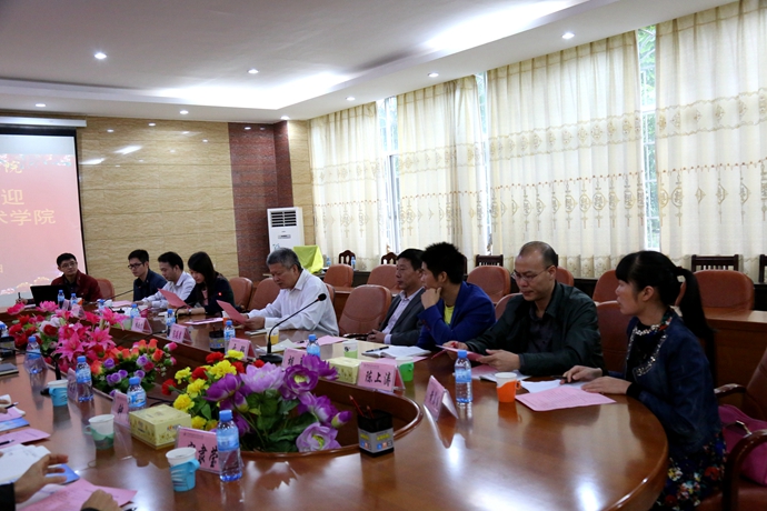 座谈会上,黄绍光首先向考察团一行介绍了我院目前的基本情况。在观看了学院宣传片后,陈廷镇表示,广西现代职业技术学院在短短的几年内,取得长足发展,实属不易,特别是学风、教风,都非常严谨、扎实,今天来到这里,看到了一些好思路、好做法、好经验,我们将认真研究,取长补短。其间,双方就当前高等职业教育的建设与发展、机电一体化专业建设等方面进行深入交流。