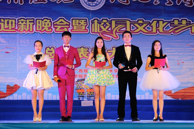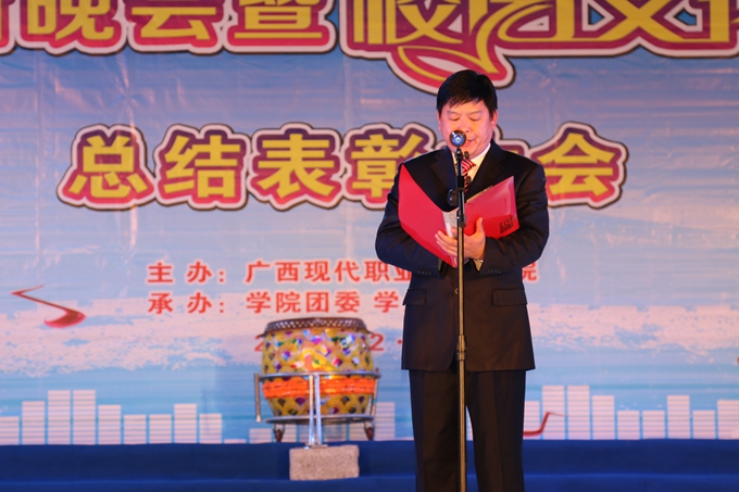 党委宣传部讯 12月23日晚,我院以“践行核心价值观,同心共铸现代梦”为主题的2016年迎新晚会在学院舞台隆重举行。学院党委书记韦伟松,院长黄绍光,纪委书记冉景峰,副院长冯忠伟,院长助理韦建军、卢森焕、覃孜,共青团河池市委员会副书记张秋文,共青团河池市委员会办公室主任黄玉广,广电局办公室主任王玲玲,广电局二级演员黄桂香,融水苗族自治县民族职业技术学校党委书记、副校长白承忠,融水苗族自治县民族职业技术学校副校长廖顺主,河池市职业教育中心学校副校长黄丹峻,河池市职业教育中心学校学生工作处处长谭冠著,河池市职业教育中心学校团委书记梁增师,河池市职业教育中心学校、融水县职业教育中心学校的学生代表,学院中层领导及全体师生欢聚一堂,观看了演出。