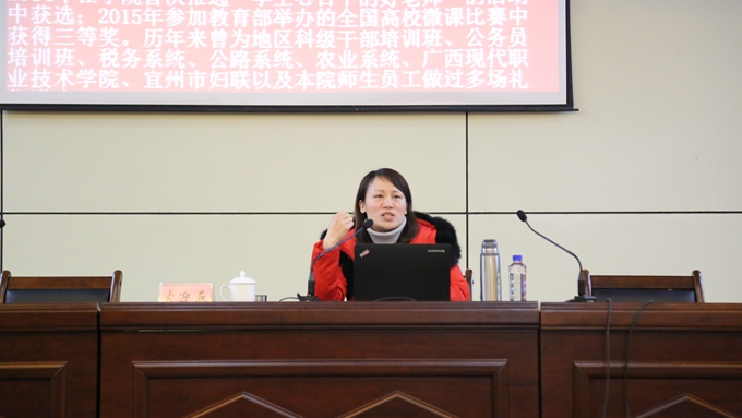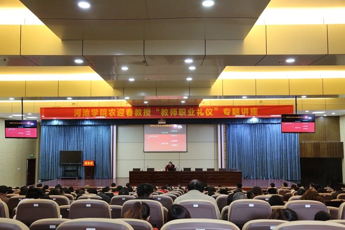 学院党委宣传部讯 1月15日下午,河池学院农迎春副教授应邀莅临我院做《教师职业礼仪》专题报告。学院党委副书记、副院长霍江华,以及学院、市职教中心全体教职工到场聆听报告会。