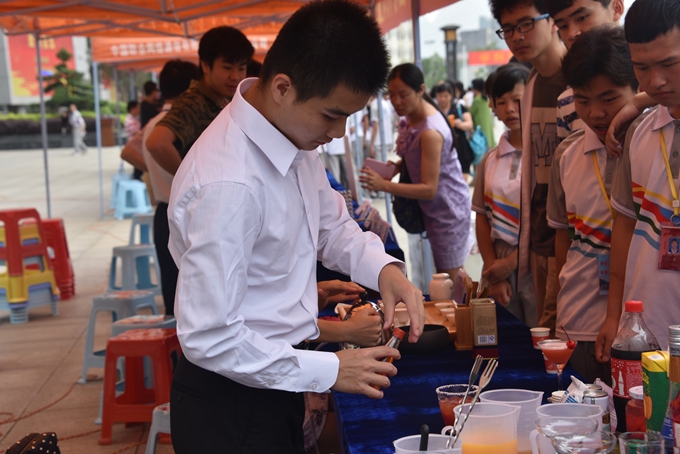为贯彻落实好职业教育活动周的要求,我院积极筹备布展工作,结合各系部自身专业特色,在当天的现场展示活动中分别设立了4个展区。高效节能型浮选机、简易纸箱封箱机等在全区高校技能比赛中获一等奖的作品以及调酒、茶艺互动体验等均在活动中展示。启动仪式后,我院展区工作人员向参观领导及师生详细讲解展品,并进行现场展示,我院的专业技能成果展示获得了参观领导的一致好评。