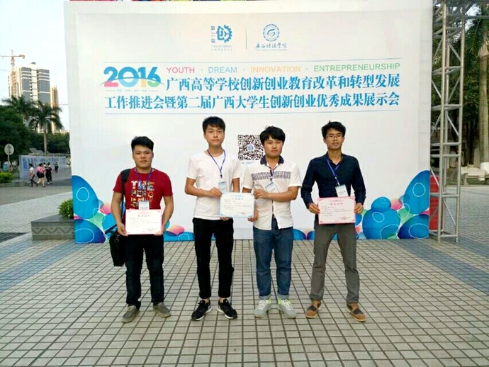 本站讯(宣传部 黄思涵) 由广西教育厅主办的“第二届广西大学生创新创业成果展示会”于2016年5月6、7日在广西财经学院举行。我院院选送的《简易纸箱封箱机》(作者:谢覃毅、韦建坤、黄勇俊、黄旭涛、韦保增;指导老师:钟清、李和明)荣获“创新成果奖”第一名;《自装卸商品运载车》(作者:陈金良、韩运东、韦宝幸、余振天、蒙元福;指导老师:刘兴国、岑华)荣获“创新成果奖”第二名。