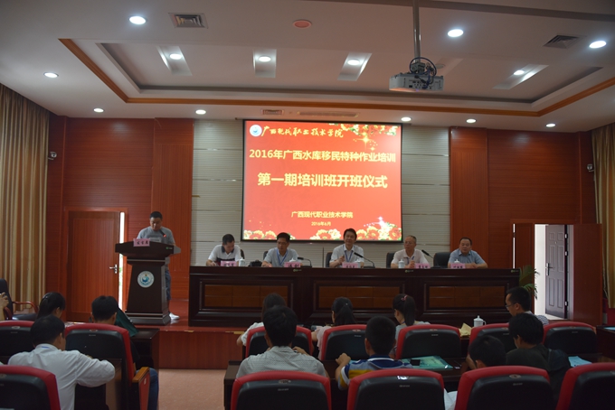 本站讯(宣传部 莫青青) 6月14日上午,我院在第二学术报告厅举行2016年第一期水库移民特种作业培训班开班典礼。来自南宁市、来宾市和贺州市的200多名库区移民学员参加此次培训。学院院长黄绍光,南宁市水库移民工作管理局培训科科长温钊,贺州市水库移民工作管理局信访科科长杨志军等出席开班典礼。仪式由学院工会主席覃志航主持。