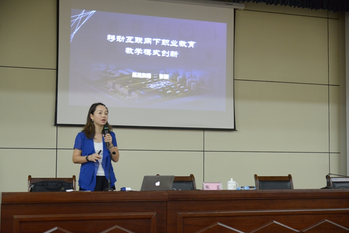 会上,张蓉作了题为《移动互联网下职业教育教学模式创新》的专题讲座。张蓉从深化职业教学数字改革,构建职业教育教学生态的现状和问题、如何建、怎么用等方面进行阐述。并指出在移动互联网下,职业教育教学模式要理念转变为先,强化师资培训;要以学生为中心,教学形式尽量直观、形象、多元;要以赛促建,集中开发校本特色的专业课程,改造原有资源和课程并盘活应用,以此建立全流程全方位资源课程应用体系,形成智慧教学软硬件一体化方案。张蓉还通过现场演示“超星学习通”的系统软件,进行“互联网+教育”的讲解。