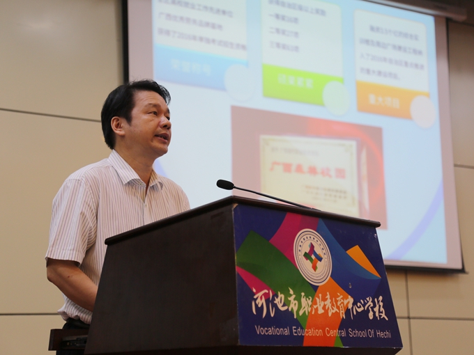 广西科技师范学院副院长李栋学在会上作讲话。他强调,职业教育发展要做好“三个创建”:一是构建人人向上的管理激励机制;二是构建适合职业能力培养的课程体系;三是构建符合职业技术技能人才要求的评价体系。要注重升学与就业并举,提升办学吸引力,增加办学贡献力。
