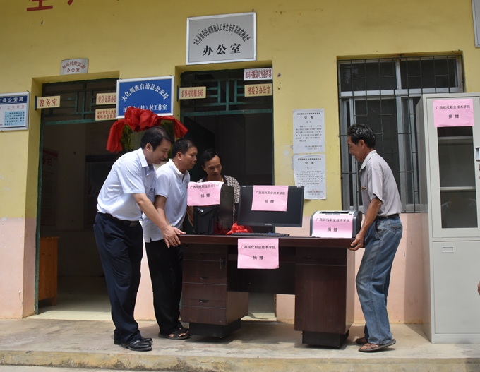 学院领导走访慰问了加司村和华善村的贫困户、老党员,与他们亲切攀谈,详细了解生活情况,并为他们送去慰问金和慰问品。学院党委书记韦伟松、学院院长黄绍光与六也乡领导共同为广西现代职业技术学院农民工培训基地、六也乡加司村生态鹅养殖基地揭牌,并向加司村、华善村两委赠送电脑、打印机、电脑桌等办公用品。