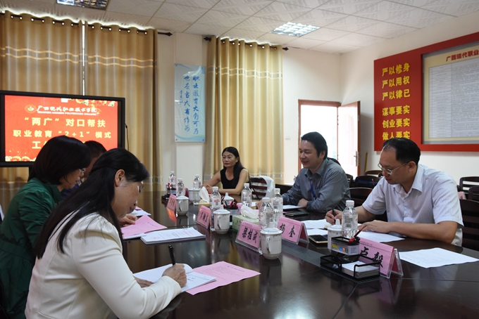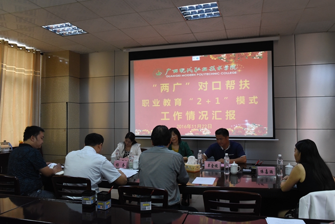 11月22日下午,自治区扶贫办专家组一行4人莅临我院检查指导工作,对我院及市职业教育中心学校的“两广”对口帮扶职业教育协作试点“2+1”模式、2015年顶岗实习工作进行验收。学院院长黄绍光出席汇报会,我院及市职业教育中心学校职能部门负责人参加汇报会。