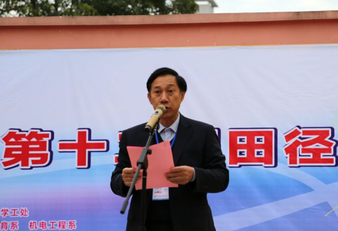 学院党委书记韦伟松宣布我院第十二届田径运动会开幕,霎时间,掌声、欢呼声响彻田径运动场。