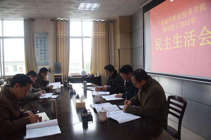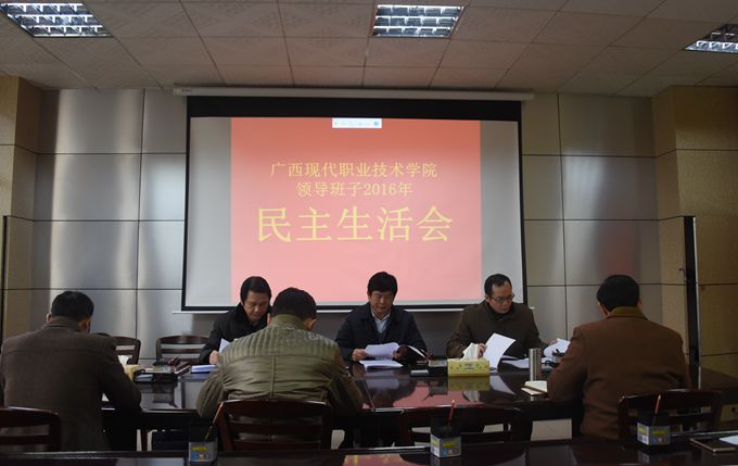 1月12日,我院召开领导班子2016年度民主生活会。学院党委书记韦伟松,院长黄绍光,市委民主生活会指导一组成员、市科技局副调研员兼市委组织员苏为民,学院党委副书记、副院长霍江华,副院长韦胜东,纪委书记冉景峰出席会议。