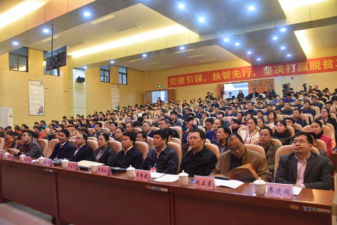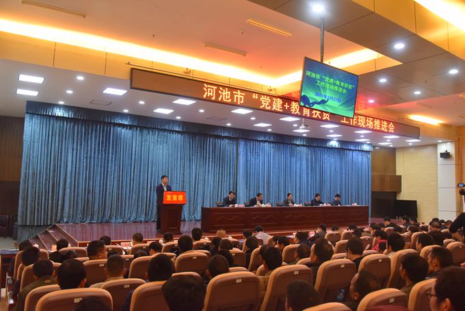 为全面深入推行“党建+”工作模式,交流工作经验,研究部署下一阶段“党建+教育扶贫”工作,3月27日,河池市“党建+教育扶贫”工作现场推进会在河池市职业教育中心学校厚德厅召开。市委常委、组织部部长马南萍,市委组织部副部长卢嘉进,金城江区区委书记覃生贤,学院党委书记、市职业教育中心学校校长韦伟松,院长黄绍光,市脱贫攻坚指挥部、市委组织部、市扶贫办、市人社局、市农业局、市财政局、市教育局、市商务局等市直单位领导以及各县(市、区)党委常委、组织部长出席会议。各县(市、区)扶贫办主任、金城江区各乡镇、街道党工委书记、我院和市职业教育中心学校部分教师以及参加学员招聘会的企业方代表等参加会议。会议由市委组织部副部长卢嘉进主持。