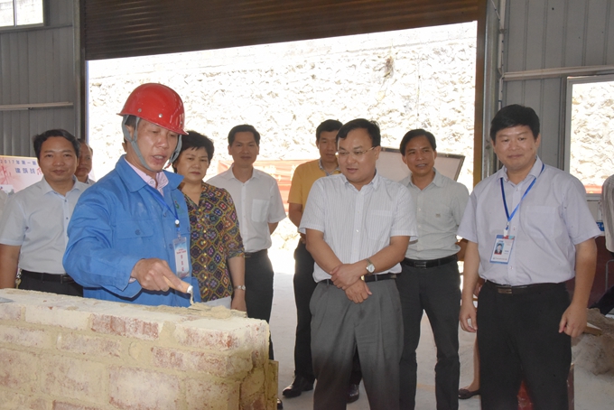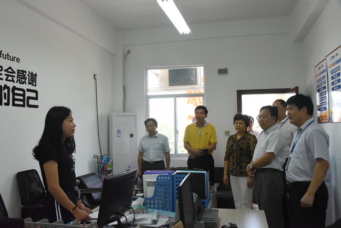 唐标文一行参观了我院“党建+教育扶贫”建筑工实训基地,唐标文与学员亲切交谈,询问他们的学习、生活情况。随后,唐标文一行还参观了河池电子商务学院以及大数据中心。