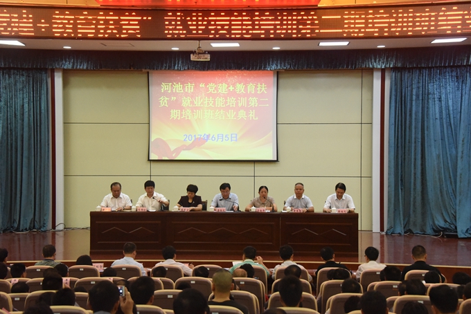 6月5日,河池市“党建+教育扶贫”就业技能培训第二期培训班结业典礼在市职业教育中心学校厚德厅召开。市委副书记、统战部部长唐标文,市委常委、组织部部长马南萍,市人民政府党组成员、副市长李凤云出席会议。学院党委书记、市职业教育中心学校校长韦伟松,院长黄绍光、环江县委书记黄荣彪、金城江区委副书记潘广军以及各县(市、区)分管扶贫工作副县长、各县(市、区)党委组织部分管副部长、市脱贫攻坚指挥部办公室分管领导以及市直相关单位领导、部分企业家代表、培训班全体学员参加会议。会议由市委常委、组织部部长马南萍主持。