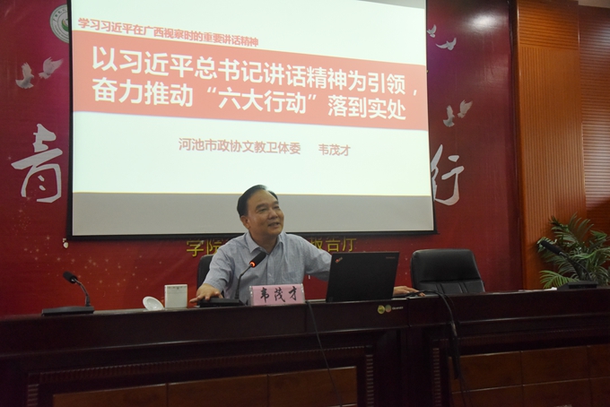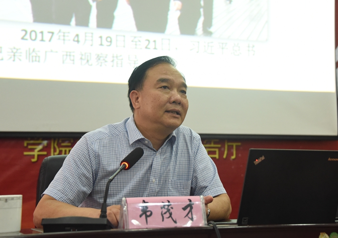 6月27日下午,市政协文教卫体委主任、市委宣讲团成员韦茂才到我院宣讲习近平总书记视察广西重要讲话精神。学院党委书记韦伟松、学院党委副书记、副院长霍江华、副院长韦胜东、纪委书记冉景峰、副院长冯忠伟出席报告会。全体教职工到场聆听宣讲报告。报告会由学院党委书记韦伟松主持。