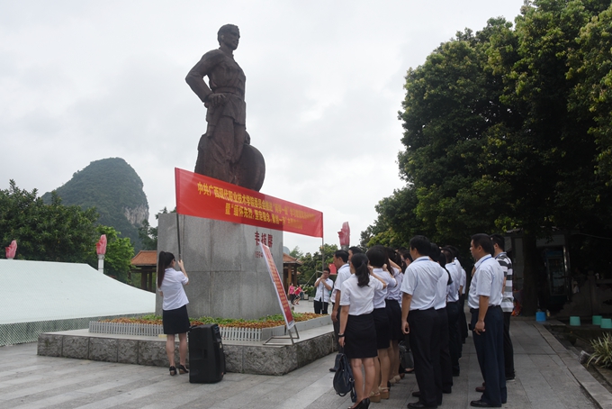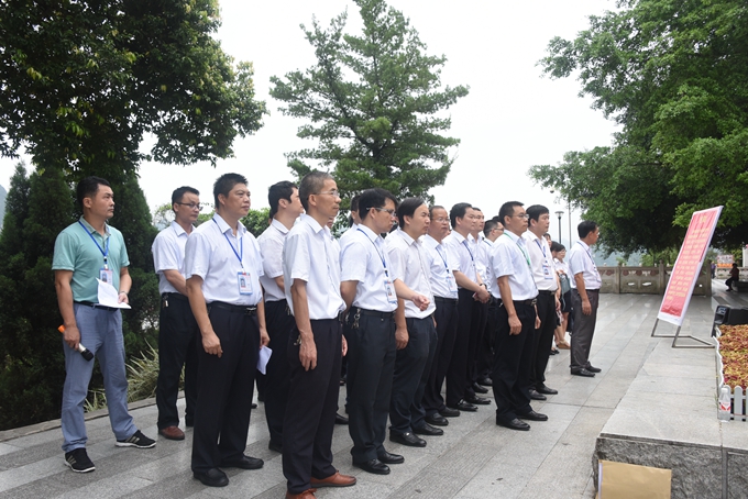 在革命烈士纪念碑前,学院党委书记韦伟松带领学院领导班子成员及全体中层干部面对党旗,重温誓词。