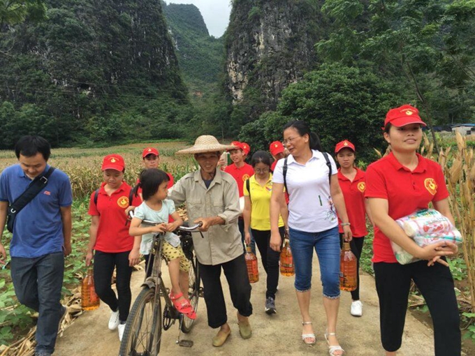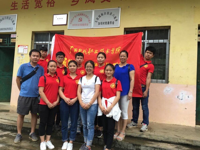 7月10日上午,我院暑期“三下乡”社会实践“扬党旗·颂党恩”政策宣讲小分队在院团委副书记李秀华和社科部覃秋燕老师的带领下,前往我院对接扶贫点大化六也加司村及华善村,开展了为期3天的社会实践活动。下午,社会实践队到达活动地点大化六也加司村,第一书记黄菁老师带领实践队员慰问贫困家庭,向他们赠送了粮油和大米等生活物资,还将文具用品送到留守儿童手中。
