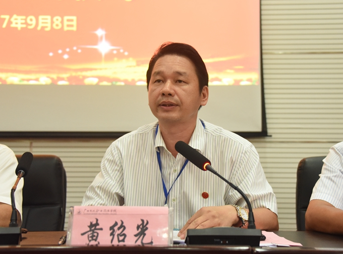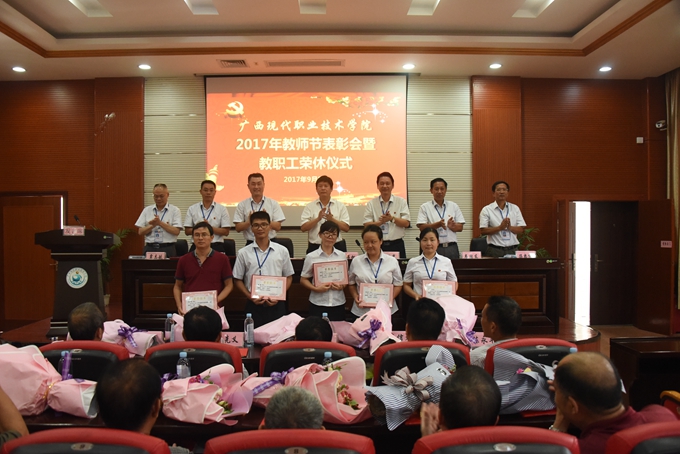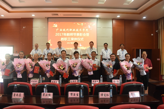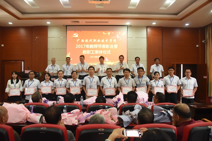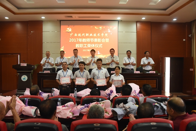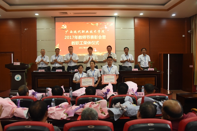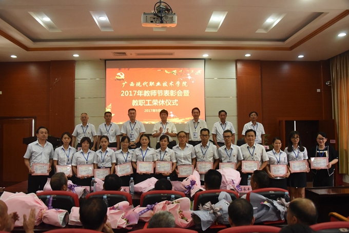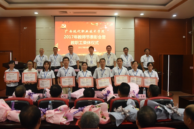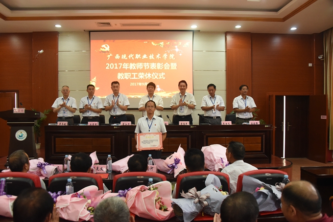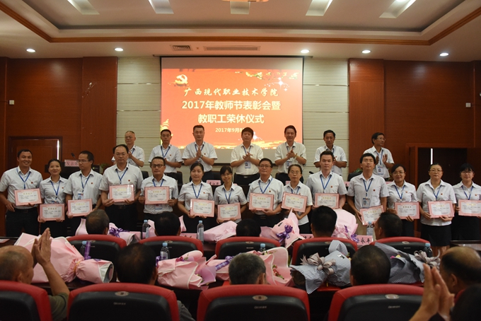 为庆祝第33个教师节,9月8日下午,我院在第二学术报告厅召开2017年教师节表彰大会暨教职工荣休仪式,对过去一年先进集体、优秀教师、优秀教育工作者、优秀班主任(或辅导员)、学生技能竞赛优秀指导教师、培训工作先进个人、项目建设突出贡献奖和教学标兵等进行表彰授奖,为光荣退休的教职工送上祝福。学院党委书记韦伟松、院长黄绍光,党委副书记、副院长霍江华,副院长韦胜东、纪委书记冉景峰、副院长冯忠伟、工会主席覃志航出席会议。全体教职工参加会议。会议由学院党委副书记、副院长霍江华主持。