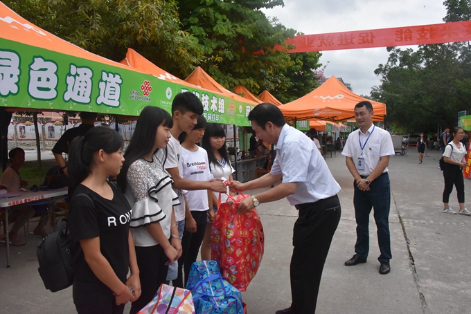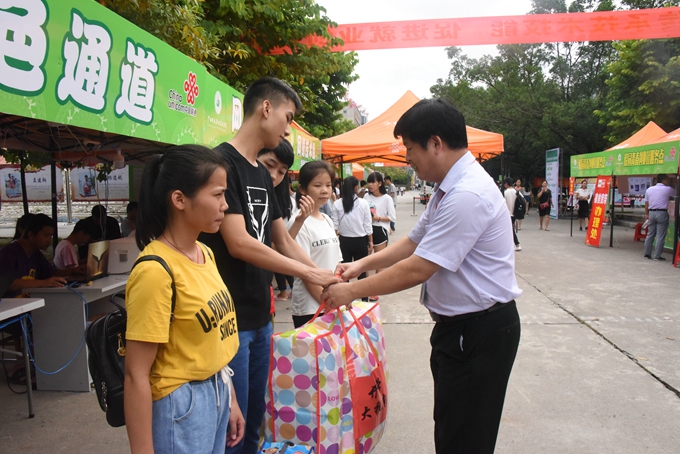 学院党委书记韦伟松为新生发放爱心助学大礼包