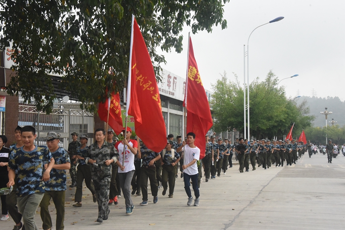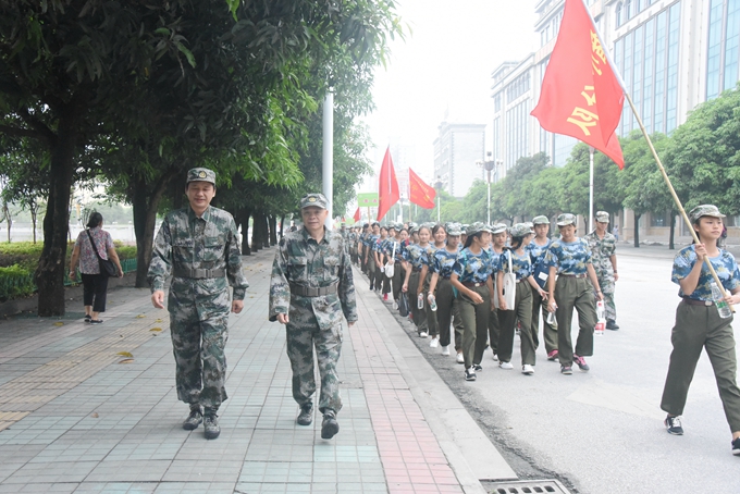 上午7时40分,2017级新生在学院领导、老师和教官的带领下,步伐整齐、精神抖擞地从学院出发。一路上,师生们高举旗帜,唱着嘹亮的军歌,迈着矫健的步伐。学院领导不时提醒学生要注意安全,同时要发扬吃苦耐劳的革命精神,展现当代大学生的青春活力。