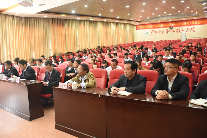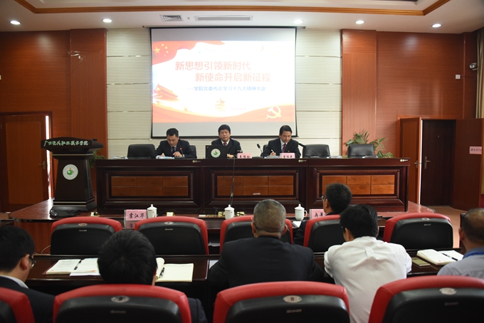 为贯彻落实中央、自治区党委的部署要求,10月31日下午,我院在第二学术报告厅召开传达学习党的十九大精神大会。学院党委书记韦伟松、院长黄绍光,党委副书记、副院长霍江华,副院长韦胜东、纪委书记冉景峰、副院长冯忠伟出席会议。全体教师党员参加会议。会议由学院党委副书记、副院长霍江华主持。