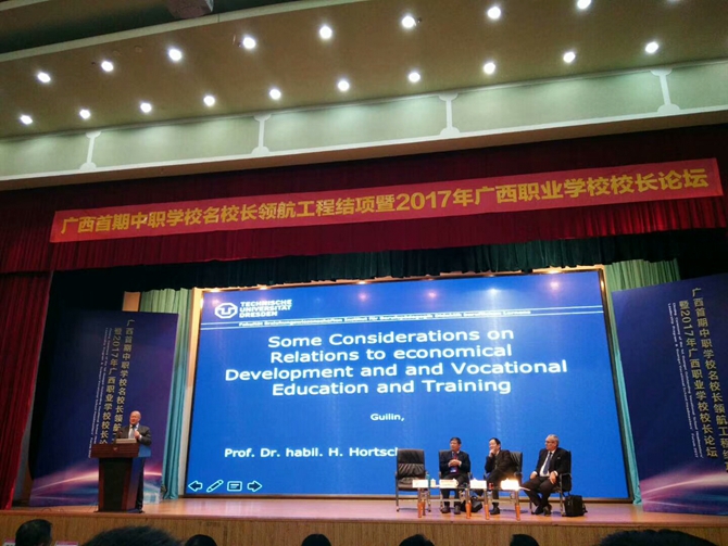 11月25日至26日,广西首期中职学校名校长领航工程毕业暨2017年广西职业学校校长论坛在广西师范大学举行。来自国内外职业教育领域的专家、广西中职名校长领航工程首期培养对象、广西70多所中职学校的校长等齐聚广西师范大学职业技术师范学院,就广西职业教育国际合作发展思路、策略、对接服务精准扶贫、完善广西职业教育培训体系建设等广西职业教育系列热点问题,以主旨报告、大会演讲、专题演讲、论文出版等形式,展开探讨和交流。