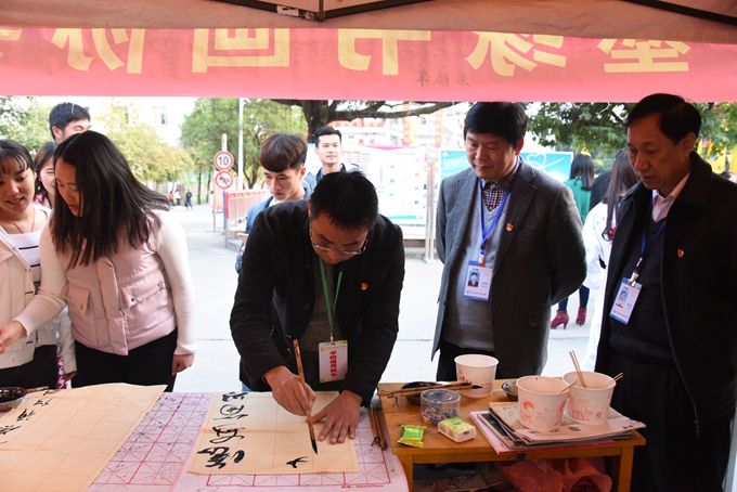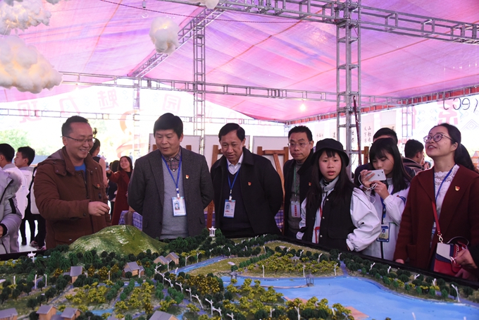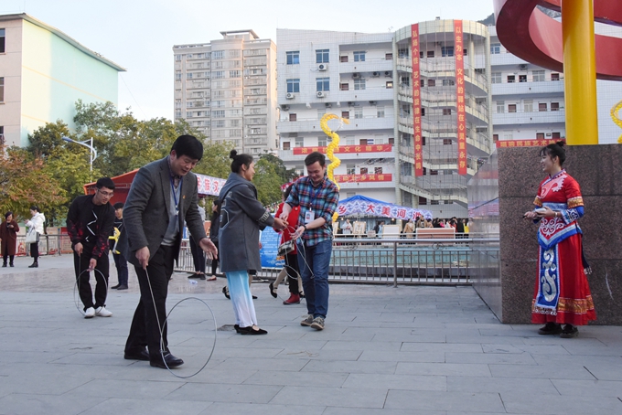 开幕式结束后,学院党委书记韦伟松、院长黄绍光、副院长韦胜东、纪委书记冉景峰到各系、各社团展区参观指导。在民族传统文化展区,韦伟松书记与同学们跳竹竿舞、滚铁环,体验民族文化的魅力。在各个展区,韦伟松书记与指导教师、制作参展作品的学生亲切交谈,鼓励大家创作出更多精品,力争把我院校园文化推向社会。